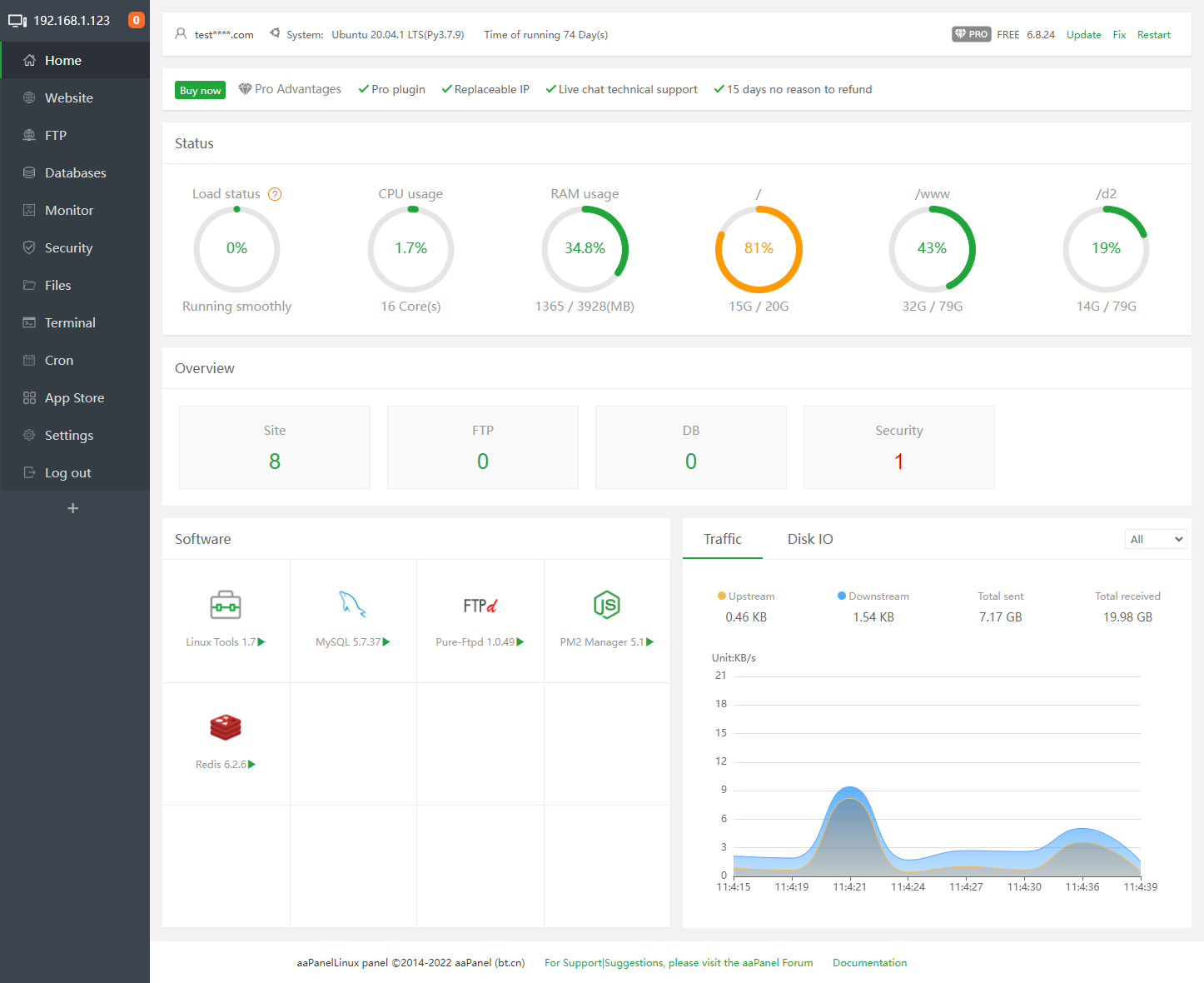 مانیتورینگ سرور از موارد خیلی مهم است که در کنترل پنل aapanel، سیستم نظارتی یا مانیتورینگ، تعبیه شده است. در مانیتورینگ aapanel وضعیت مموری (RAM) ، real-time CPU و مقدار فضای استفاده شده، مانیتور یا پایش می‌شود.